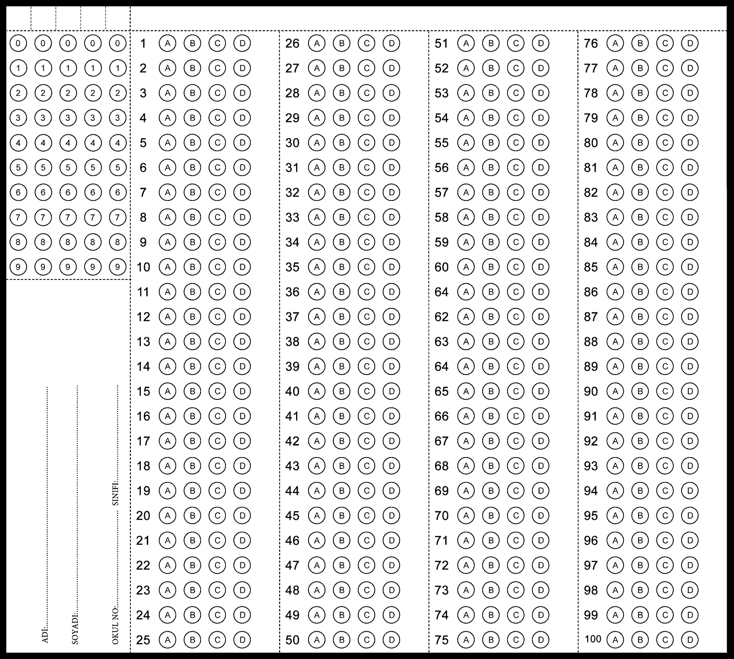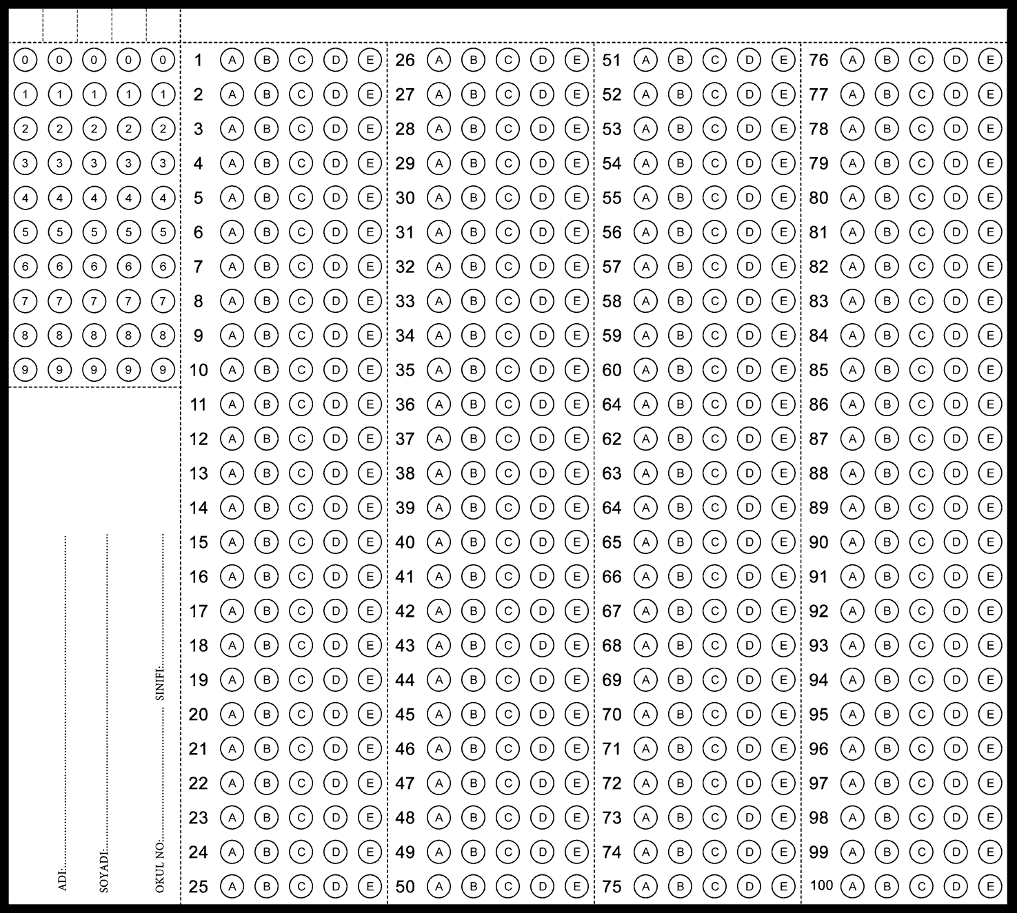 5 seçenek 30 soruluk optik formu çoktan seçmeli, eşleştirme ve doğru yanlış seçenekli soru tipleriyle kullanabileceğiniz şekilde aşağıdaki gibi kullanabilirsiniz.